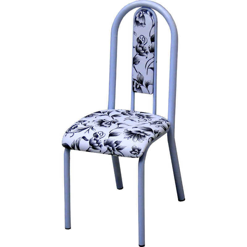 O assento e o encosto são estofados, revestidos em tecido floral com fundo branco e flores em preto, oferecendo conforto e um toque decorativo elegante. O encosto alto com abertura inferior garante leveza visual e melhor ergonomia no uso diário.